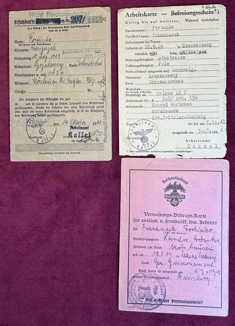 In a very good condition a document group of a non- Reichs German. The documents are all made out to a Polish man Franciszek Fortunka who is working as a milker for Konrad Hartmann. The man is described as stateless because Poland did not exist and Germany did not see them as a legal person with a country. Nonetheless this man worked since 1941 in this German company where it even had a compulsory contribution to the Reichsnährstand card.