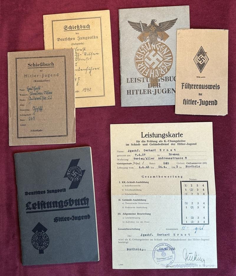 In an excellent condition a Group of documents from a member of the Hitler Youth. All documents are made out to Gerd Ernst who became a Deutsches Jungvolk mitglied from 1937 and a Hordenführer in 1938, various shooting books of the DJ and HJ. Also a Hitlerjugend Leistungsbuch where he achieved the silver Leistungsabzeichen in 1943. Afterwards at the age of 16 he particpated in an examination as war training instructor (Kriegsausbildung Übungsleiter) where he scored very good.