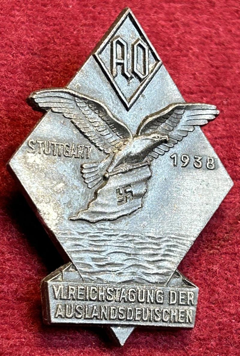 In a very good condition a 6th Reich Conference of Germans Abroad in 1938 Frontside: AO (Auslands-Organisation der NSDAP) Large eagle flying with the NSDAP flag above the sea. Stuttgart 1938. VI. Reichstagung der Auslandsdeutschen Backside: Safety pin. Maker marked Franz Zimmermann from Stuttgart, RZM M9/42