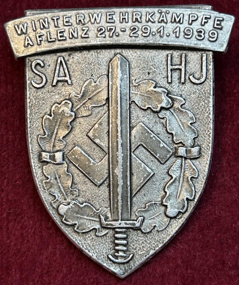 In an excellent condition a SA/HJ Winter war games Aflenz 1939 Frontside: Sturmabteilung/ Hitlerjugend WInterwehrkämpfe Aflenz 1939 with the SA Sport emblem. Backside: Safety pin. Maker marked Ulbricht from Wien, RZM 9/235.