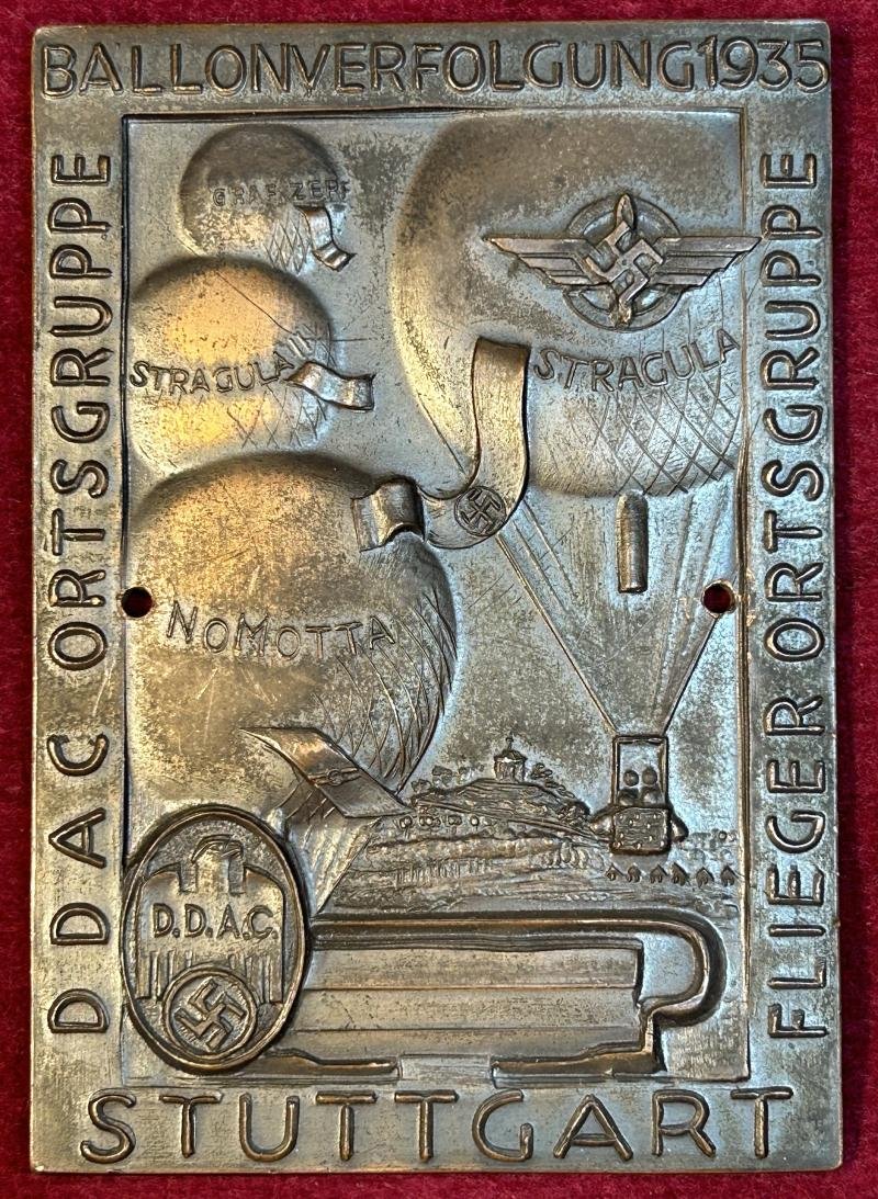 In an excellent condition a very rare DDAC Area group Stuttgart balloon pursuit 1935 Mountable plaque with 2 holes for screws. Frontside DDAC (Der Deutsche Automobil Club) Ortsgruppe. Fliegerortsgruppe. Stuttgart. Ballonverfolgung 1935.4 hot air balloons with different names. Nomotta, Stragula II, Graf Zeppelin and the Stragula with a DLV (Deutsche Luftsport) emblem and wimpel with Swastika. with country side panorama. DDAC emblem in the left corner Backside: Maker marked A. Rettenmaier from Gmünd. Unclearly marked by (owner?) H. Reichle? With some SS markings scratched into the back. Background info: These NSKK balloon trips were done every year and were followed by DDAC car drivers across country roads. Size: Hight +/- 8,5 x width +/- 6 cm