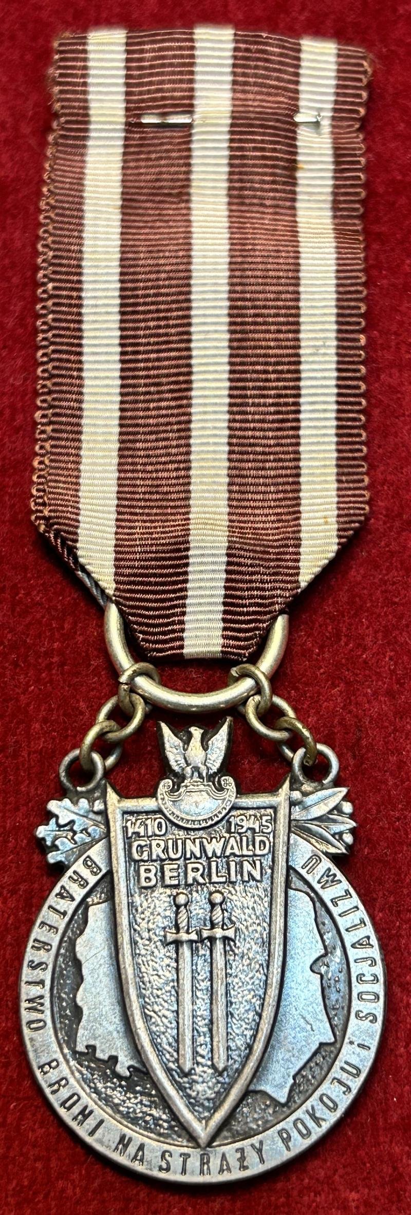In an excellent condition a Poland PRL Brotherhood of Arms Badge (1975 version) The medal was established on October 7, 1963. The badge was awarded to soldiers of the Armed Forces of the People's Republic of Poland and the armies of other socialist countries, as well as citizens of the Polish People's Republic and other socialist countries as a symbol of merits in strengthening bonds of friendship, brotherhood of arms and cooperation between the armies of socialist countries in the common struggle for peace and socialism. The badge was awarded by the Minister of National Defense. On October 14, 1991, Resolution No. 232 of the Council of Ministers was declared invalid. Frontside: An image of the Grunwald Badge against the background of Poland's borders. On the rim there is an inscription: BROTHERHOOD IN ARMS GUARDING PEACE AND SOCIALISM. In the upper part of the badge there are oak leaves on one side and laurel leaves on the other. Backside: There is the inscription MINISTERSTWO/OBRONY/NARODOWA in three lines, and around it POLSKA RZECZPOSPOLITA LUDOWA. In the first version, the badge was attached with two chains to a ribbon bar, and from 1975 to a ring through which was attached to a ribbon. This medal is the 1975 version Ribbon, 30 mm wide, burgundy color with three narrow white stripes.