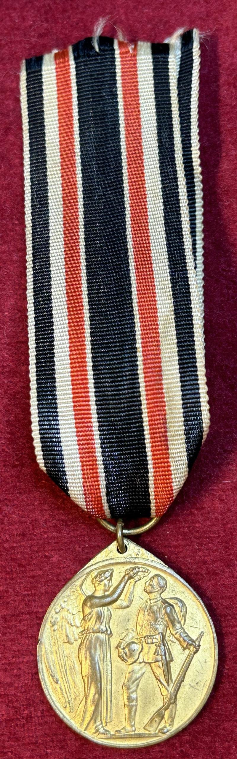 In an excellent condition a commemorative medal For the fatherland 1914 Deutsche Ehrendenkmünze des Weltkrieges with an original ribbon. The foundation of this non-governmental award goes back to the instigation of the association of national-minded soldiers. In this association, an Order Council was formed which was responsible for the award. The statutes were kept so general that almost everyone could receive this medal. After the federation of national-minded soldiers was banned, the 'Order Council of the German Commemorative Medal of the World War' existed as an independent body from the summer of 1921. The Council of the Order awarded the medal on behalf of (the German Emperor), who, however, distanced himself from this award. The association was headed by the honorary marshal, Colonel General Karl von Einem, the chancellor, retired captain Rudolph Hering-Deutschwehr (founder of the foundation), and the board of directors. Hering-Deutschwehr left the association in 1924. The honorees were combined on a voluntary basis to form the 'German Legion of Honour'. Famous leaders of the association included Ludendorf, Bülow and Roßbach. The combat badge was awarded to frontline participants who only had to assure without proof that they had been at the front. The draft of the medal, the certificate and the battle badge came from the artist Franz Stassen. With the later foundation of the Cross of Honor of the World War in 1934, the Council of the Order was dissolved on July 28, 1934 and no more medals were awarded. The capital of the association was handed over to the government for the benefit of war victims. Round medal with a rim made of bronze (also gold-plated) with a widening of the rim at the top with a hole to accommodate a small ring, with the ribbon ring on it. Front: On the left a standing winged goddess of victory, arms forward and up, holding a laurel wreath.. On the right is a soldier with a steel helmet in his right hand. In the left hand a rifle standing on the ground, pointing slightly backwards. Back: In the center is the depiction of the Iron Cross from 1914. Oak leaf branches at the bottom, some of which reach up to the Iron Cross. In the upper half on the edge the inscription in Fraktur - FÜRS - VATERLAND - The battle badge consists of a laurel wreath through which a sword is inserted diagonally from below. Rear with cotter pins.