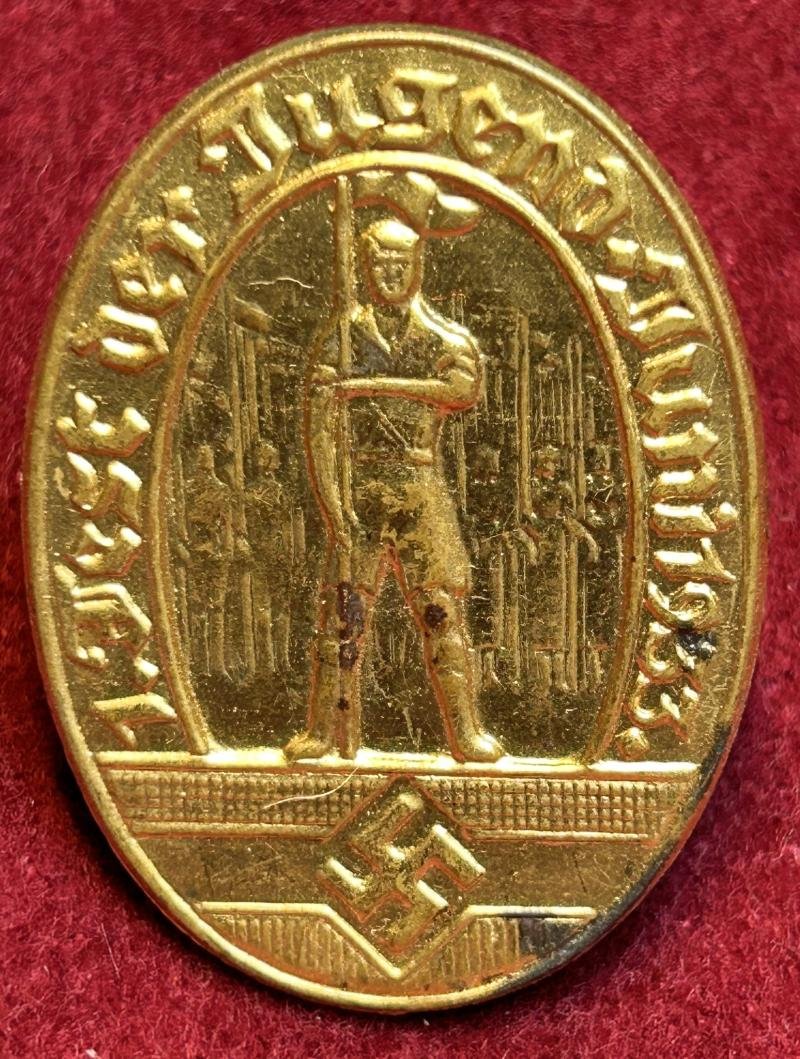 In a very good condition an early HJ badge 1st. youth feast June 1933 Frontside: 1. Fest der Jugend Juni 1933. Young man holding a flag with hundreds behind him. Swastika underneath. Backside: stickpin. No maker markings