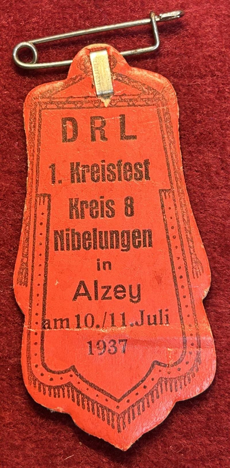 In a very good condition a Deutscher Reichsbund für Leibesübungen 1st district feast in Alzey 1937 paper badge. Frontside: DRL 1. Kreisfest Kreis 8 Nibelungen in Alzey am 10./11. Juli 1937 Backside: Safety pin