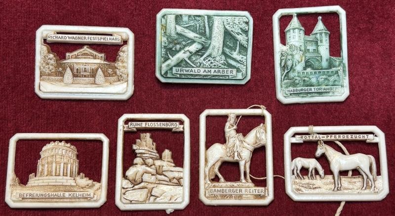 In a very good condition WhW WhW buildings and landscapes in the Gau (7 pieces) 1. Richard Wagner Festspielhaus 2. Urwald am Arber 3, Hamburg Tor Amberg 4. Befreiungshalle Kelheim 5. Ruine Flossenbürg 6. Bamberger Reiter 7. Rottal-Pferdezucht Gau Bayerische Ostmark (1942)