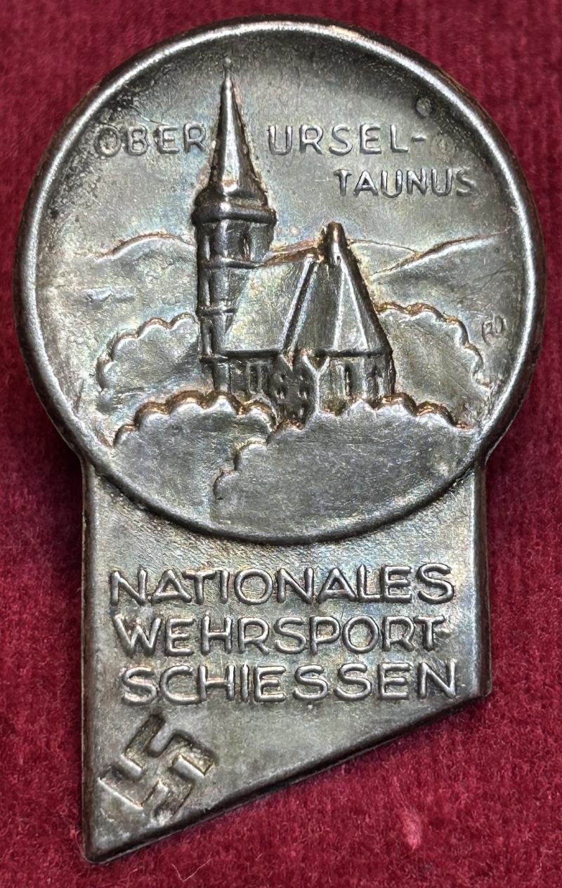 In an excellent condition a National military shooting event Oberursel Taunus Frontside: City view Oberursel-Taunus. Nationales Wehrsport-Schiessen. Swastika.. Maker or artist markings ED Backside: Stickpin.