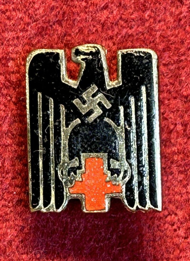 In an excellent condition a German red cross civilian badge (15mm) Frontside: Large black eagle with Swastika standing on a red cross Backside: Safety pin. No maker markings