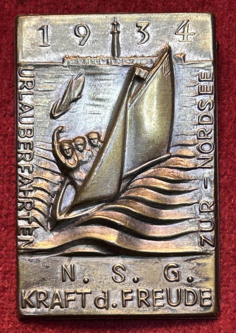 In an excellent condition a NSG Strength through Joy Holiday trip to the North Sea 1934 Frontside: NSG Kraft durch Freude Urlauberfahrten zur Nordsee 1934. Sailboat with light tower in the back. Backside: Safety pin