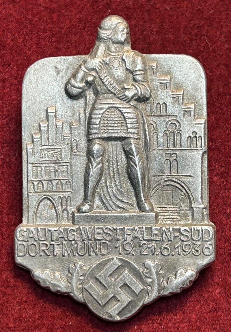 In an excellent condition a NSDAP rally Westphalia-South Dortmund 1936 badge Frontside: City view of Dortmund old market with statue from a 18th century character, Gautag Westfalen-Süd Dortmund 19-21. Juni 1936. Swastika between oakleaves. Backside: Safety pin. Maker marked Walgo from Kierspe-Bhf. (Bahnhof) Westfalen-Süd
