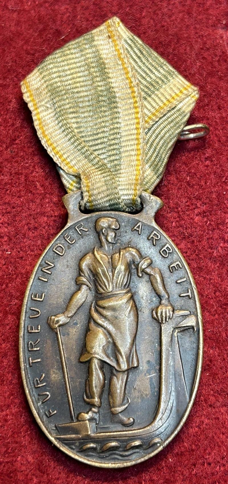 In an excellent condition a Saxony Medal from the Leipzig Chamber of Commerce for loyalty at work Frontside: Für treue in der Arbeit. A man with big hammer on a viking ship Backside: Safety pin on the ribbon. Handelskammer Leipzig