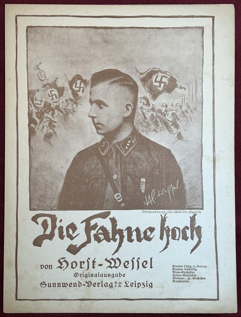In an excellent condition sheet music with the NSDAP anthem 'The flag high' Horst Ludwig Georg Erich Wessel (9 October 1907 – 23 February 1930) was a Berlin Sturmführer ('Assault Leader', the lowest commissioned officer rank) of the Sturmabteilung (SA), the Nazi Party's stormtroopers. After his killing in 1930, he was made into a martyr for the Nazi cause by Joseph Goebbels. Wessel first joined a number of youth groups and extreme right-wing paramilitary groups, but later resigned from them and joined the SA, the brownshirted street-fighting stormtroopers of the Nazi Party. He rose to command several SA squads and districts. On 14 January 1930, he was shot in the head by two members of the Communist Party of Germany (KPD). Albrecht 'Ali' Höhler was arrested and charged with his murder. Höhler was initially sentenced to six years in prison, but was forcibly taken out of jail and killed by the SA after the Nazis came to power. Wessel's funeral was given wide attention in Berlin, with many of the Nazi elite in attendance. After his death, he became a major propaganda symbol in Nazi Germany. A march he had written the lyrics to was renamed the 'Horst-Wessel-Lied' ('Horst Wessel Song'), and became the official anthem of the Nazi Party. After Adolf Hitler came to national power in 1933, the song became the co-national anthem of Germany, along with the first verse of the 'Deutschlandlied', also known as 'Deutschland über alles'.