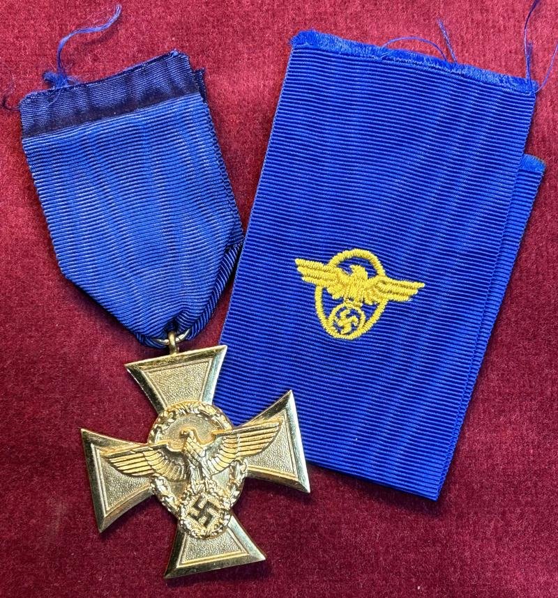n an excellent condition a police gold 25 years service award Service award of the police 1st level for 25 years 1938 The service awards for the police were donated on the 5th anniversary of the seizure of power by the National Socialists on January 30, 1938 by the Führer and Reich Chancellor Adolf Hitler. The award consisted of 3 levels. The 1st level for 25 years of loyal service, the 2nd level for 18 years and the 3rd level for 8 years of loyal service in the police force. The 1st and 2nd stages are crosses, gold plated and silver plated respectively. The 3rd level is a medal. When calculating the length of service, periods of military service and periods as civil servants were taken into account. People who were expelled from the NSDAP could not be honored. From 1940, retirees and civil servants who were reinstated could also be awarded. The time before retirement and the time after re-employment counted. From 1941 police reservists and from 1942 members of the air protection police were also entitled to receive messages. From November 1941, the award was extended to Austria and the Sudetenland. On August 12th, a golden oak leaf with the number 40 was donated. However, this was no longer manufactured or distributed. The awards ended on December 19, 1944. The 25-year service award has a silver-grey national police eagle embroidered on the ribbon. There are crosses in gilded bronze or silver-plated war metal. Source: J. Nimmergut, German Orders and Decorations up to 1945, Vol. IV, 2001. Gold-plated metal cross with raised, 2 times stepped polished edges. The inside of the cross arms are finely grained. Front and back with an oval central shield. At the top a soldered ordinary eyelet with a band ring. Frontside: The national emblem of the police is placed in the middle. An eagle with spread wings head left, seated on a wreath of oak leaves. In it the swastika placed on its point. The oval is formed from oak leaves bound at the top and running behind the eagle and wreath. Backside: The oval central shield with a raised edge and a smooth background. FÜR TREUE DIENSTE IN DER POLIZEI Ribbon: blue 36 mm wide ribbon embroidered in gold the national police eagle.