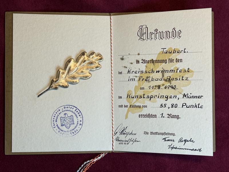 In an excellent condition a NSRL Recognition 1st place at the district swimming contest Golden leave price for the swimmer named Taubert. August 11 1940 in the free swimmingpool Rositz The stamp of the gymnastics club is Vater Jahn (father John). Friedrich Ludwig Jahn is the Turnvater Jahn (the father of the turncommunity). The stamp is from Thüringen (Thür.) The Swimming pool of the municipality Rositz is in the small community Schelditz and was built in 1934. Rositz is part of Thüringen