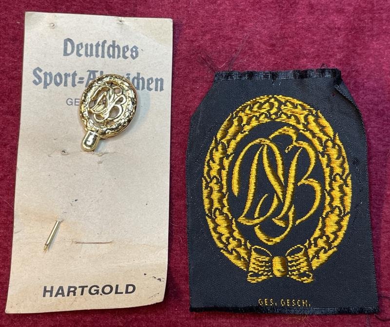 In an excellent condition a Bundesrepublik Deutschland DSB sport gold medal miniature and cloth badge Gold DSB medal Cloth badge, marked Ges. Gesch. Miniature stickpin with original award paper Frontside: DSB inside a wreath with ribbon. Number 5 for 5 times repeating to receive a golden medal. Backside: Marked Ges. Gesch. Deutscher Sport Bund. Steinhauer & Lück from Lüdenscheid