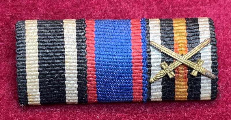 In an excellent condition a ribbon bar with 3 ribbons. 1. Eisernes Kreuz 2. Klasse 1914 2. Oldenburg, Friedrich August Kreuz 2.Klasse 1914 3. Frontkämpferehrenkreuz mit Schwertern
