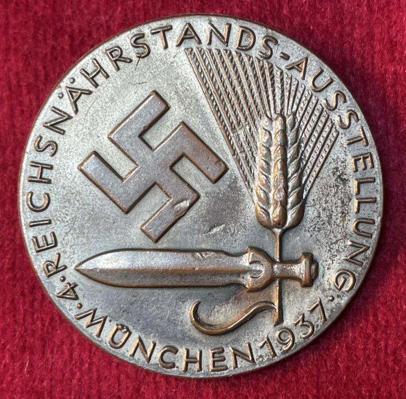 In an excellent condition a 4th Reichsnährstand München 1937 Badge Frontside: 4. Reichsnährstands-Ausstellung München 1937. Sword, wheat and Swastika Backside: Safety pin, maker marked Robert Neff from Berlin W35
