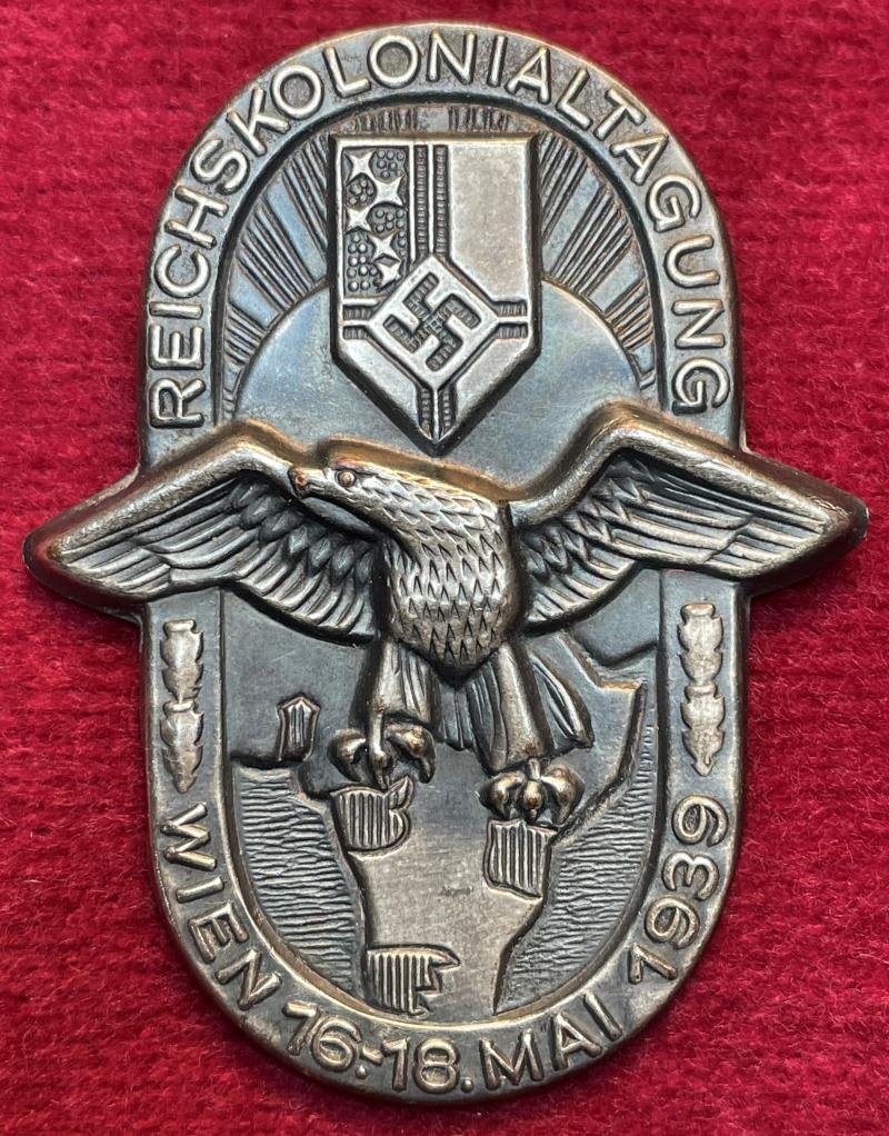 In a very good condition a Empire Colonial League Vienna 1939 badge Frontside: Reichskolonialtagung Wien 16.-18. Mai 1939. Emblem of the RKB in front of the sun and with a large eagle holding the colonies with its claws in African continent below. The former colonies have been marked with vertical lines. Backside: Safety pin. No maker markings.