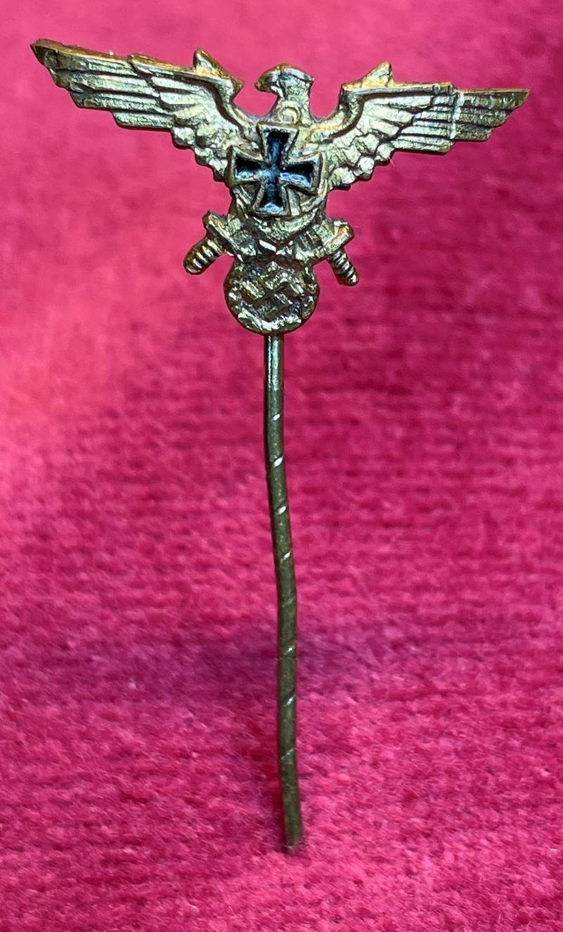 In an excellent condition a navy association membershipspin Frontside: Golden colored pin with eagle and crossed sword. Iron cross in front. Underneath a wreath with Swastika. Backside: Marked with Ges. Gesch. No maker markings