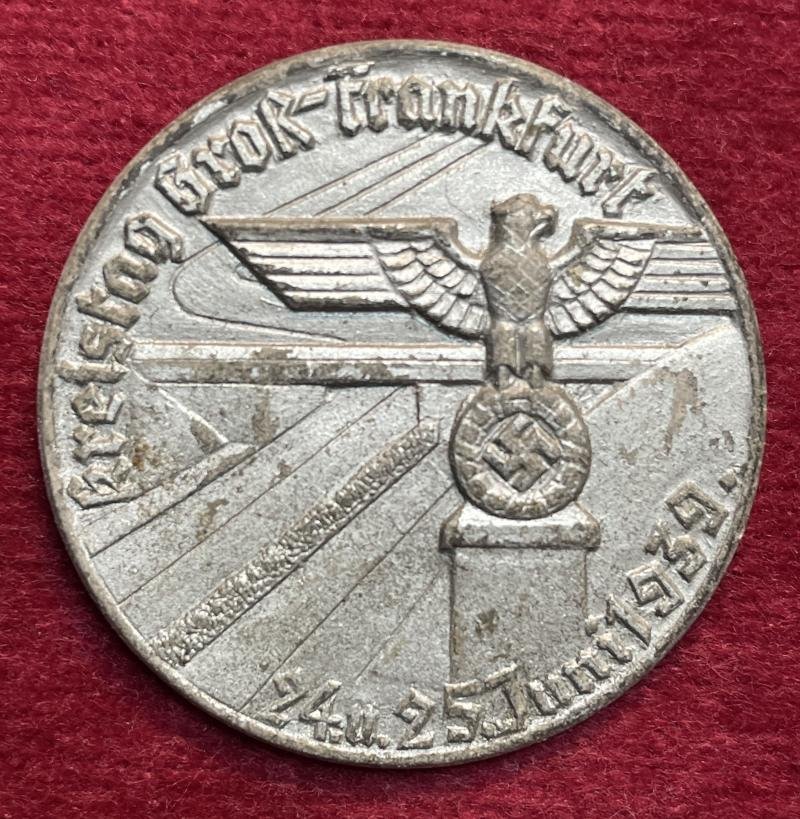 In a very good condition a district council day Great-Frankfurt 1939 badge Frontside: Kreistag Gross-Frankfurt 24. und 25. Juni 1939. Eagle with Swastika on top of a pedestal. Backside: Safety pin. Maker marked E. Ferdinand Wiedmann from Frankfurt am Main S.10