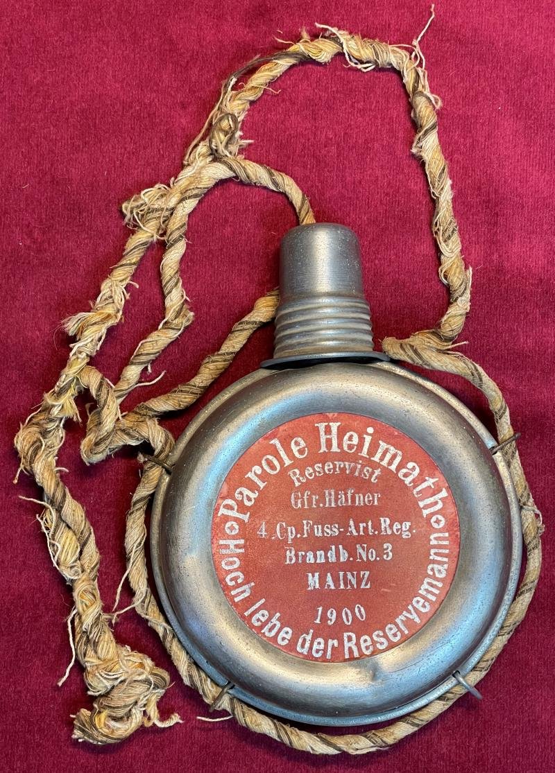 In a good condition a reservist bottle from the Brandenburger Foot Artillery Regiment No. 3 Frontside: Parole Heimath, Hoch lebe der Reserveman. Reservist Gefreiter HĂ€fner 4. Cp. Fussartillerie regiment Brandenburgischer No. 3 Mainz Dated 1900 Backside: Du warst mein Trost in trĂŒben Stunden das hab ich als Soldat entfunden. Last part of the sentence has been lost. In the middel a soldier is standing wit his flask holding the hand of his lady and in the other hand a sword.