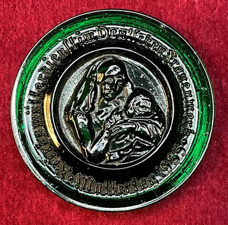 In a mint condition a WhW donation badge mothersday Reichsmutterdienst Frontside: Reichtmutterdienst im Deutschen Frauenwerk - Muttertag 1935' Mother and child Backside: Safety pin. Maker marked Werkgemeinschaft Bad Ilmenau