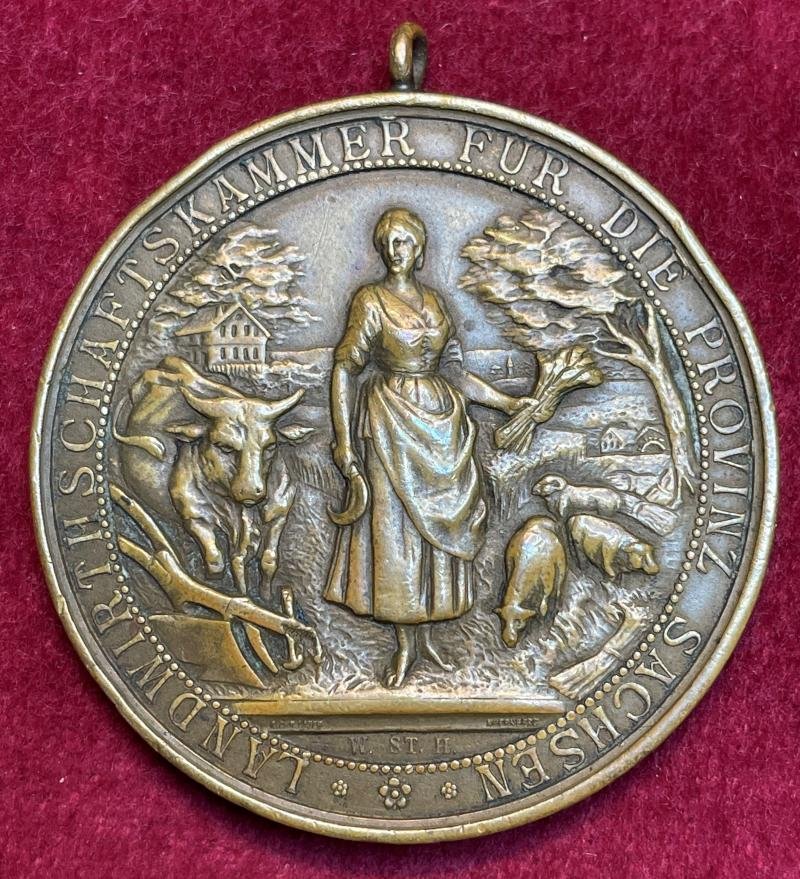 In an excellent condition a 1st modell long years service medal Chamber of Agriculture province Saxony From 1816-1944 Saxony was part of Prussia as a province. It was a very rich province and a lot of agriculture activity. This medal is the 1st modell that comes from the charmber of agriculture from this province. It dates the medal to the end of 19th century up to the beginning of the 20th (1890-1905) Frontside: Figure of a woman in rural clothing with a sickle and a bundle of corn with a country view of live stock farms, rural village. Maker marked L. Christian Lauer from Nürnberg. W. ST. H. is most likely the designer of the medal. Backside: Für langjährige Treue Dienste. There is some scratching on the medals back.