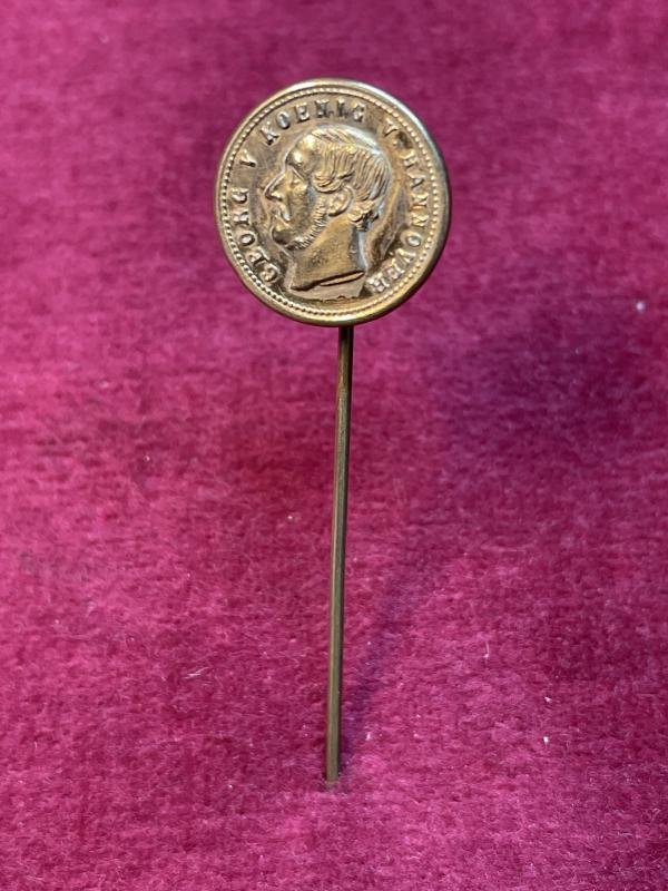 In a very good condition a miniatur stickpin George V king of Hannover. A remembrance or patriotic King George V of Hannover stickpin. Time period end of 19th century. George V (Georg Friedrich Alexander Karl Ernst August; 27 May 1819 – 12 June 1878) was the last King of Hanover, the only child and successor of King Ernest Augustus. George V's reign was ended by the Austro-Prussian War, after which Prussia annexed Hanover.