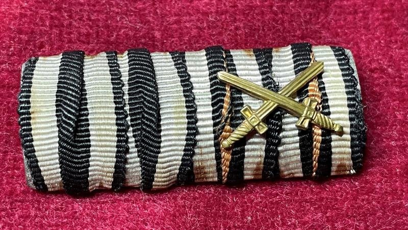In a very good condition a 2 medal ribbon bar Field clasp made in south german style 1. Eisernes Kreuz 2. Klasse 1914 2, Frontkampferkreuz mit Schwertern 1914-1918...