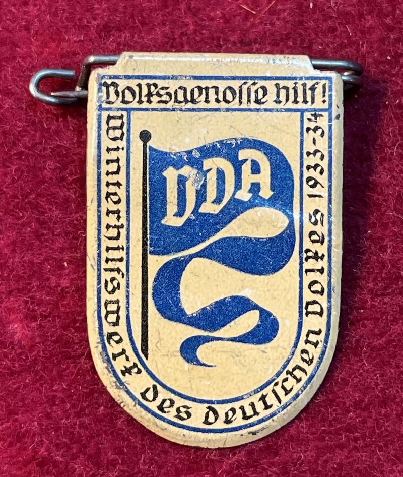In an excellent condition a VDA pennant from 1934 Frontside: Volksgenosse hilf! Winterhilfswerk des Deutschen Volkes 1933-34 Backside: Safety pin