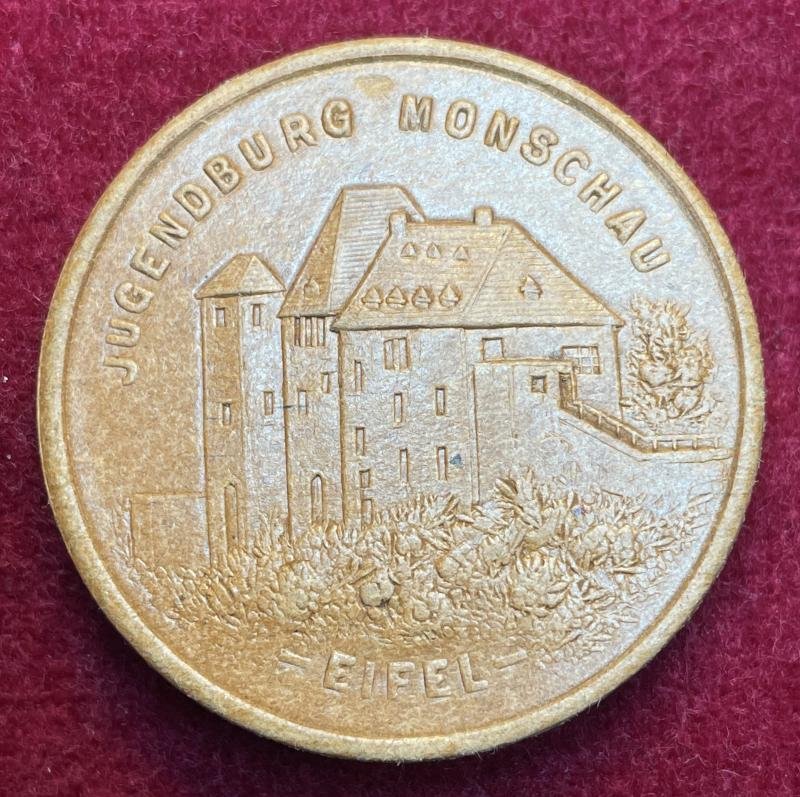 In an almost mint condition DJH event paper badge. Reichsstraßensammlung zum Reichswerbe- und Opfertag des Reichsverband des Deutsches Jugendhergs vom Mai 1938 Frontside: Jugendburg Monschau im Eifel Backside: Safety pin. No maker markings