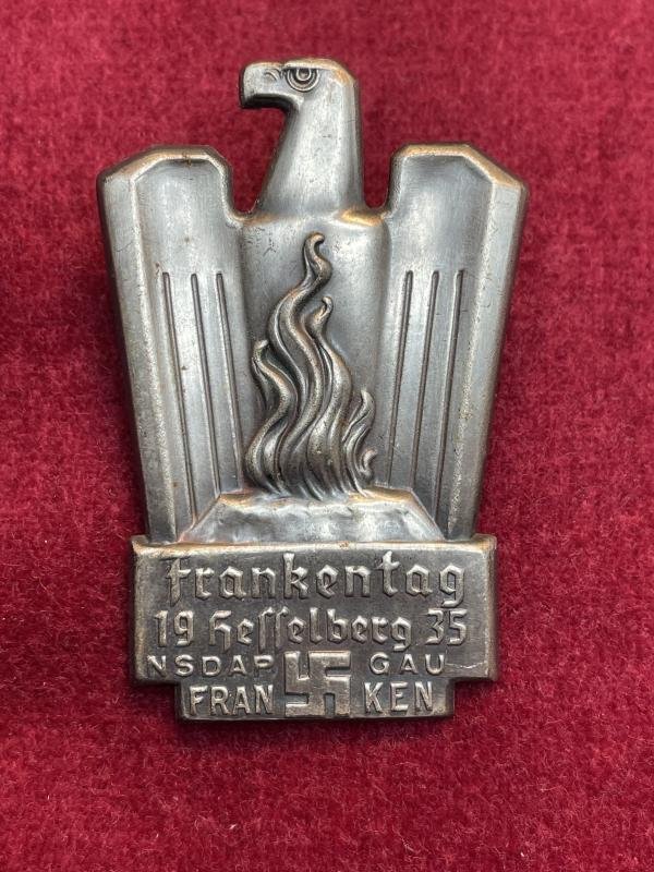 In an excellent condition a NSDAP Franken day 1935 badge Frontside: Large eagle, in front a fire. Frankentag 1935 Hesselberg NSDAP Gau Franken with Swastika. Backside: Safety pin. some flash rust spots. No maker markings
