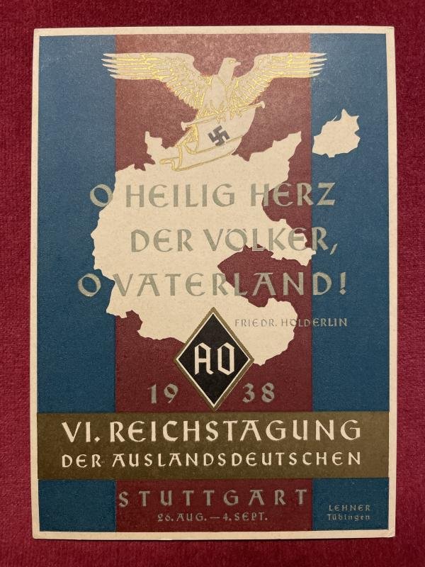 In an excellent condition a very rare postcard 4th Reich Conference of Germans Abroad Frontside: O heilig Herz der Völker, O Vaterland ! Friedrich Hölderlin. 1938 VI. Reichstagung der Auslandsdeutschen Stuttgart. 26. Augustus - 4. September. Lehner Tübingen Backside: Johann Christian Friedrich Hölderin. Dihter des Deutschen Idealismus. WIth stamp of this conference.