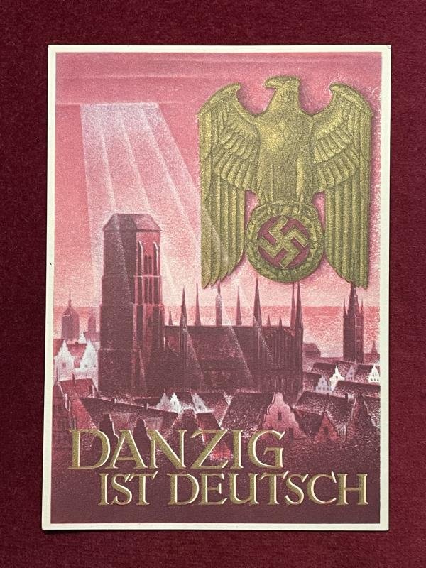 In an excellent condition a postcard Danzig is German. Frontside: Danzig ist Deutsch. City view of Danzig. Swastika and Eagle Backside: Entwurf Gottfried Rlein from München. Kriegs Winterhilfswerke Postkarte. Zentralverlag der NSDAP Franz Eber.