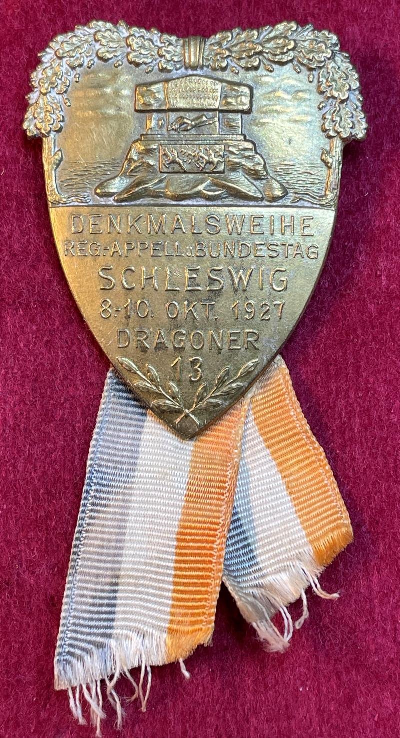 In an excellent condition a dedication badge from the 13th Dragoon reg. from Schleswig-Holstein Frontside: Wreath with under the regimental monument at Garnisonfriedhof Schleswig. With some worn ribbons Denkmalsweihe Regiment Appell-Bundestag Schleswig 8.-10. Oktober 1927 Dragoner 13 Backside: Safety pin. No maker marks present On November 7, 1867, the association was given the name Schleswig-Holstein Dragoon Regiment No. 13. It was initially distributed over a few smaller towns in Saxony. On July 1, 1871, Flensburg and Hadersleben were assigned to the regiment as garrison. In October 1877 the association moved to St. Avold and Saarburg in Lorraine and on April 1, 1886 to Metz as the final garrison. The regiment was subordinate to the 33rd Cavalry Brigade in Metz. The regiment was absolved in 1919