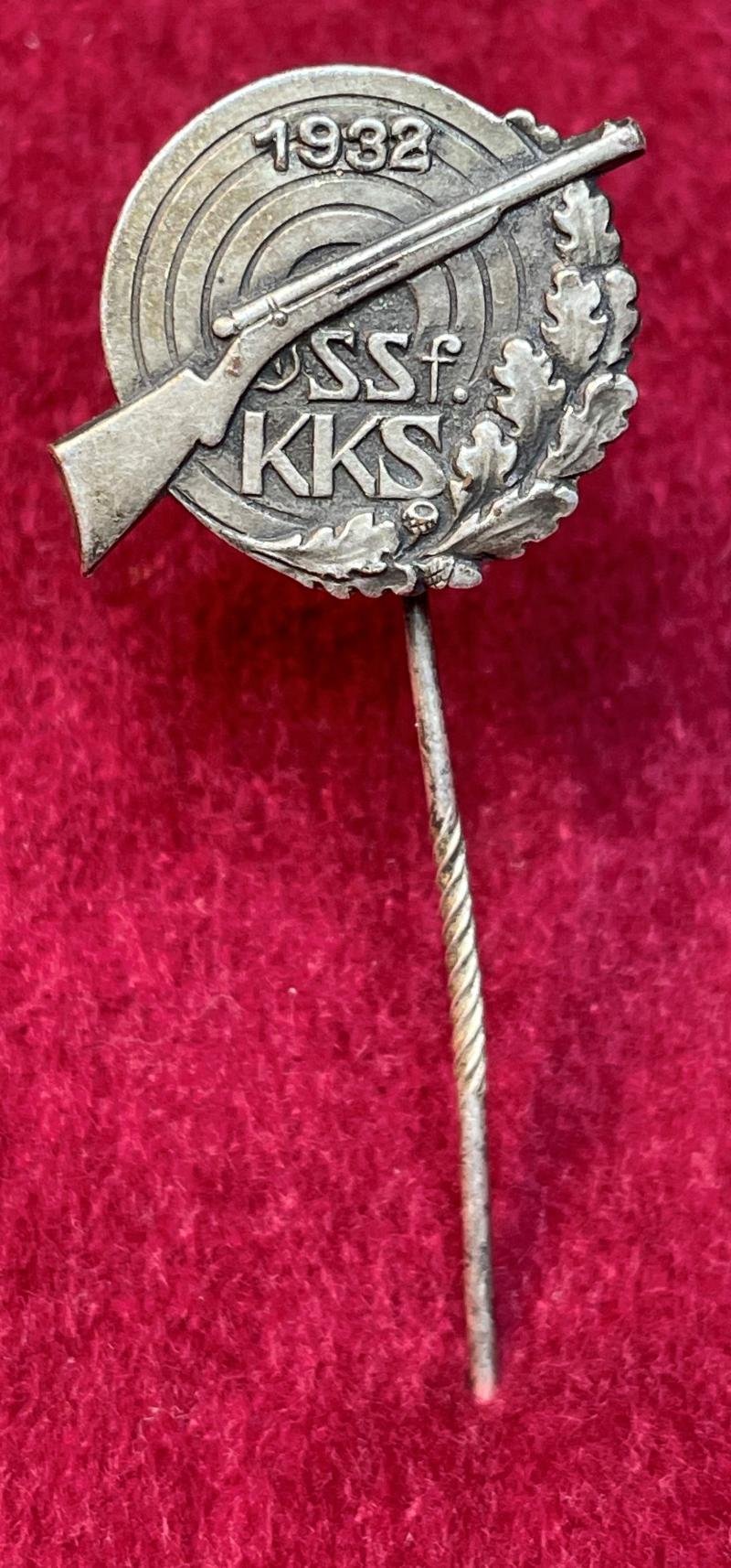 In an excellent condition a 1930 silver DKJS stickpin The Deutsche Kartell für jagd- und Sportschiessen 1932 Silber nadel. Tip of the needle is a bit bend. Priced accordingly Frontside: Silver shooting disc, 1932. Rifle. SSf. KKS. SportSchiessenfest. Klein Kaliber-Schiessen. With Oakleaves on the side. Backside: Needle attachment. E. Schmidhäussler frin Pforzheim