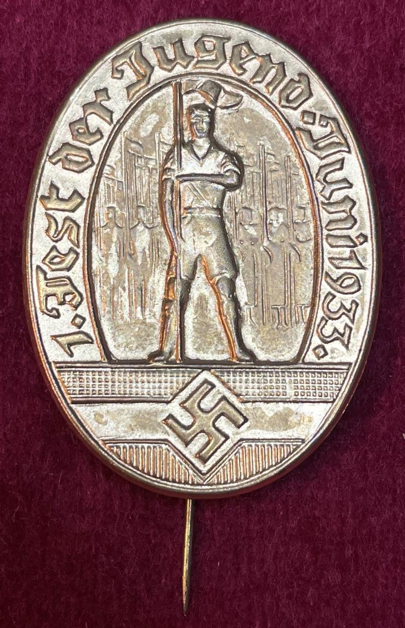 In an excellent condition an early HJ badge 1st. youth feast June 1933 Frontside: 1. Fest der Jugend Juni 1933. Young man holding a flag with hundreds behind him. Swastika underneath. Backside: stickpin. No maker markings