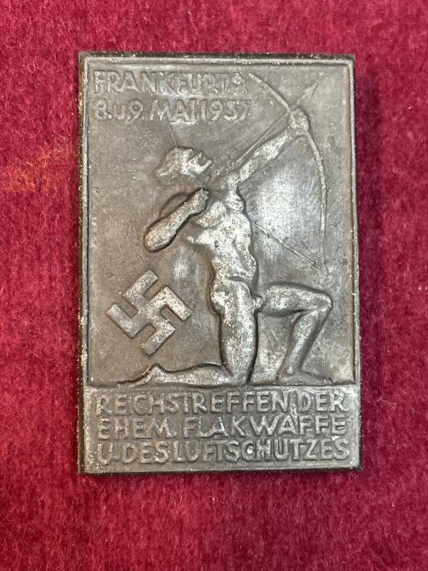 In a very good condition a Frankfurt meeting badge of Air Raid and Air Protection services Frontside: Frankfurt 8.u.9Mai1937 Reichstreffen der Ehem. Flakwaffe U. DesLuftschutzes. Reichs meeting of the former Air Raid and the Air protection. Swastika behind a man aiming an arrow at the sky Backside: Maker marked E.F. Wiedmann from Frankfurt am Main. Entwurf (designed by) G.JMBerger
