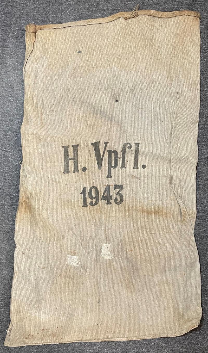 In an excellent but used condition a Wehrmacht jute rations sack Dated 1943. H.Vpfl. (Heeres Verpflegung) otherside Eagle with Swastika inside a wreath. Blackness of letters and eagle are in excellent condition Some small repairs have been done during war time. It is about 105 cm long by 65 cm wide.
