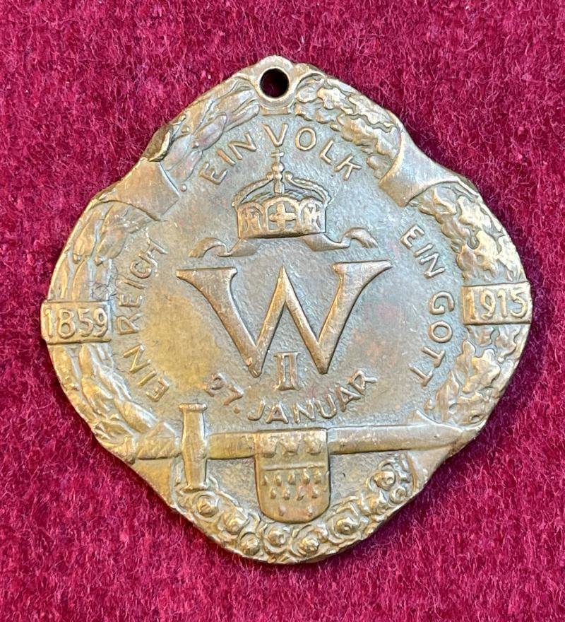 In an excellent condition a 'patriotisches Abzeichen Wilhelm II Ein Reich Ein Volk Ein Gott 27 Januar 1859-1915' W (Wilhelm) II with Emperial crown Maker marked on the back the company G. Hermeling from Köln, actually it has been made by Joseph Kleefisch (1861–1931) who was married to the daughter of Gabriel Hermeling. Joseph was his partner and took over his business after Gabriel went sick beginnen 20th century and died in 1904. They were both very high end artistic silver smiths. After Gabriel's death Joseph kept on using G. Hermeling as maker marking.