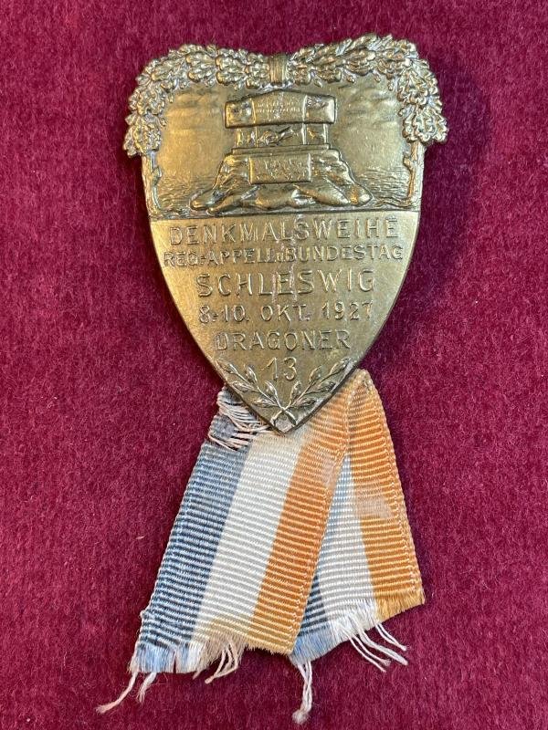 In an excellent condition a dedication badge from the 13th Dragoon reg. from Schleswig-Holstein Frontside: Wreath with under the regimental monument at Garnisonfriedhof Schleswig. With some worn ribbons Denkmalsweihe Regiment Appell-Bundestag Schleswig 8.-10. Oktober 1927 Dragoner 13 Backside: Safety pin. No maker marks present On November 7, 1867, the association was given the name Schleswig-Holstein Dragoon Regiment No. 13. It was initially distributed over a few smaller towns in Saxony. On July 1, 1871, Flensburg and Hadersleben were assigned to the regiment as garrison. In October 1877 the association moved to St. Avold and Saarburg in Lorraine and on April 1, 1886 to Metz as the final garrison. The regiment was subordinate to the 33rd Cavalry Brigade in Metz. The regiment was absolved in 1919