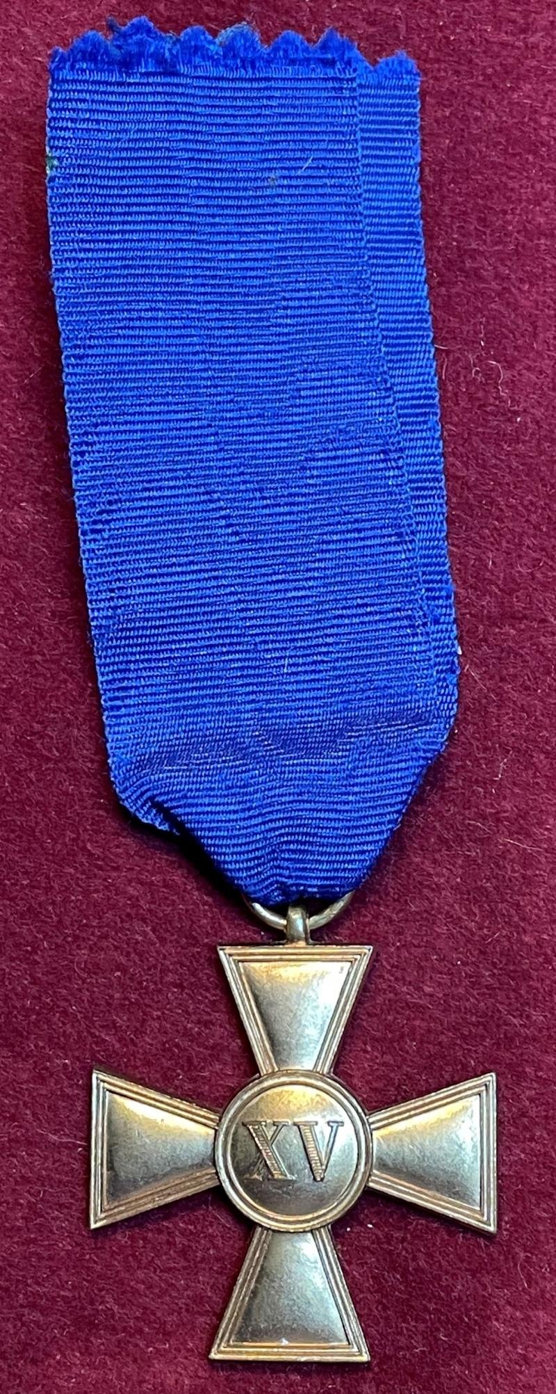 In an almost mint condition a Service award 1st class 1913 for 15 years Ribbon is new! The service decorations for non-commissioned officers and soldiers were first presented on June 18, 1825 together with the service decoration cross for officers by King Friedrich Wilhelm III. donated. The first form of the service award was in the form of a buckle. 1st Class was silver gilded and awarded after 21 years of service. 2nd Class was a silver buckle and was awarded after 15 years of service. The 3rd grade was an iron clasp with a silver frame. It was awarded after 9 years of service. On July 4, 1913, the form and the years of award were changed by decree. The 1st class was now awarded from the age of 15 and was a cross. From then on, the 2nd and 3rd classes were awarded in the form of medals after 12 and 9 years of service. The 1st class was awarded to non-commissioned officers and soldiers who had honorably completed their service in the armed forces for 15 years. Copper cross with smooth cross arms. The edge bordered by three lines. Front and back with a round central shield embossed with it. At the top a soldered, ordinary eyelet with a band ring. Front: Central shield with Prussian royal crown surrounded by a round recessed rim Back: Central shield with the Roman numeral 15 - XV - surrounded by a round recessed rim. The thicker vertical lines are cross-hatched. Tape: 36 mm wide blue.