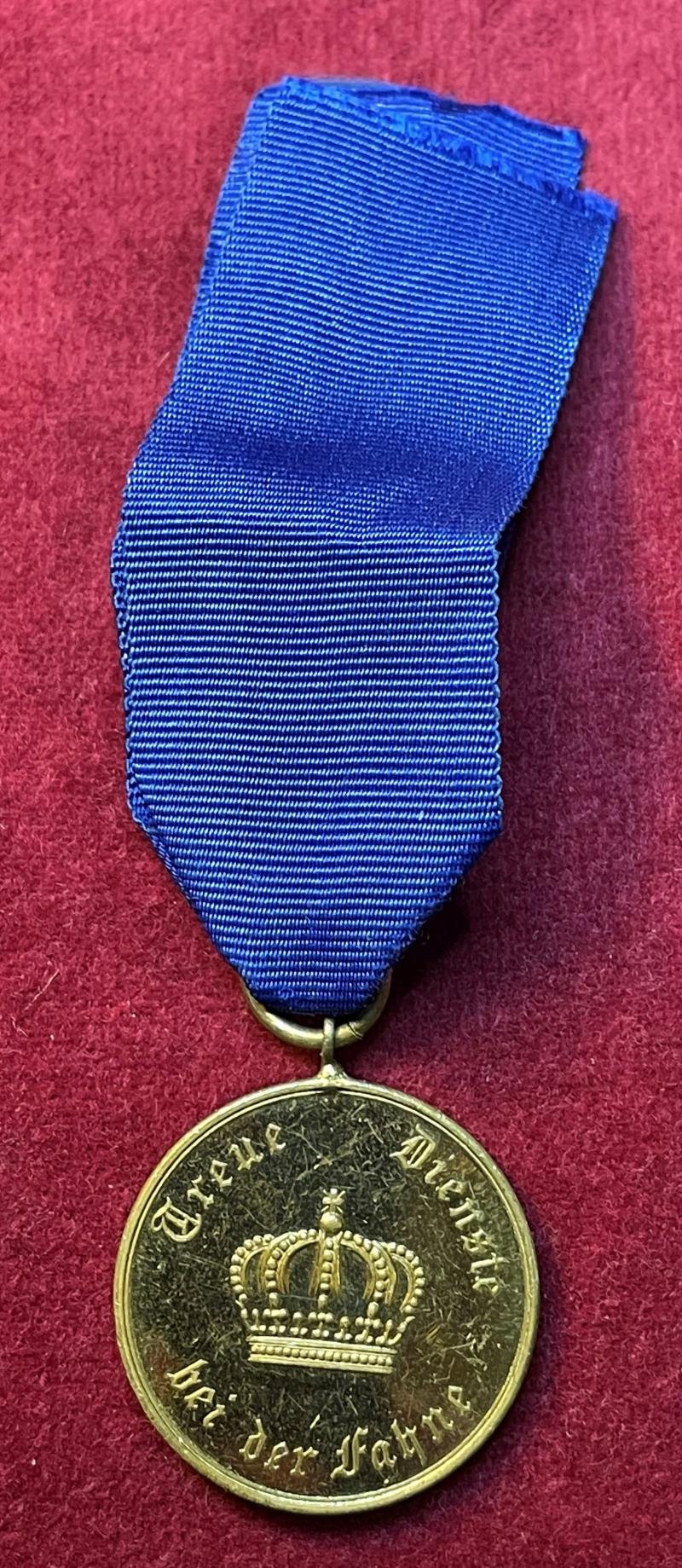 In an almost mint condition a 2nd class service medal Ribbon is new! The service decorations for non-commissioned officers and soldiers were first presented on June 18, 1825 together with the service decoration cross for officers by King Friedrich Wilhelm III. donated. The first form of the service award was in the form of a buckle. 1st Class was silver gilded and awarded after 21 years of service. 2nd Class was a silver buckle and was awarded after 15 years of service. The 3rd grade was an iron clasp with a silver frame. It was awarded after 9 years of service. On July 4, 1913, the form and the years of award were changed by decree. The 1st class was now awarded from the age of 15 and was a cross. From then on, the 2nd and 3rd classes were awarded in the form of medals after 12 and 9 years of service. The 2nd class was awarded to non-commissioned officers and soldiers who had honorably completed 12 years of service in the armed forces. Round medal made of bronze with a raised rim, an ordinary eyelet with a ribbon ring soldered on at the top. Front: In the middle the Prussian royal crown, above and below in a semicircle the writing: Above: - loyalty - services - below: - at - the - flag -. Back: In the middle the Roman numeral 12 - XII - the broad parts of the number crosshatched. Tape: 36 mm wide blue.
