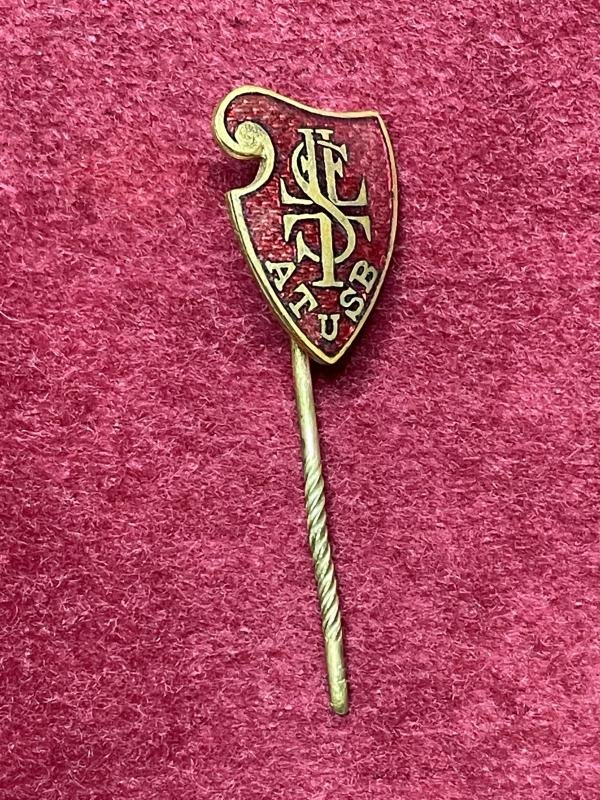 In an used condition an ATuSB memberships pin Needle is broken, priced accordingly. The ATuSB stands for Arbeiter Turn- und Sportbund. This organisation was part of the Socialist party (SPD). This member stickpin or Mitgliedsabzeichen 5.Form The organisation ATSB existed between 1893 - 1933. After the take over by the NSDAP the union was forbidden and all sportfields and buildings were seized.