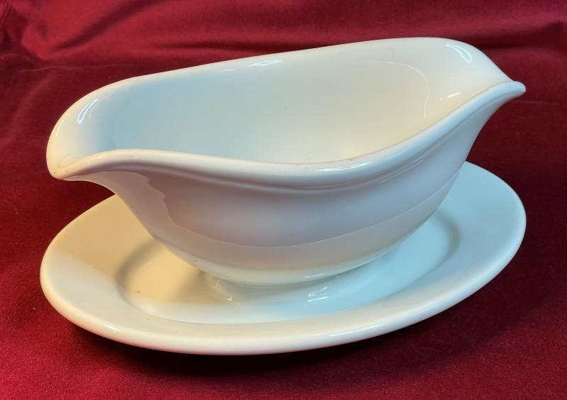 In an almost mint condition a Luftwaffe Gravy boat Maker marked Bohemia (location Neurolau), which is a subsidiary of Allacher Porzellanmanufaktur in the annexed Protectorate of Bohemia and Moravia. Dated 1942 Late Luftwaffe eagle holding a Swastika. Fl. U.V. which stands for Flieger Unterkunft Verwaltung, or the Flight Barracks Administration, the agency responsible for Luftwaffe accommodations. These gravy boats were made by various makers and used by different organisations like the Kriegsmarine and the RAD. Approx. 24 cm long and 11,5 cm high. Very heavy a little bit over 1,4 kilograms