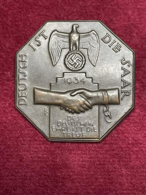 In a very good condition a patriotic badge for the Saarabstimmung in January 1935 The Saarbeckengebiet was controlled by the English and French from 1920 -1935 for the League of Nations. When the people were asked to make a choice between incorporation in France or Germany the NSDAP would try to influence the votes amongst initimidation but also with patriotic badges like this badge. Frontside: Deutsch ist Die Saar (The Saar is German) Eagle with swastika inside a wreath. Two hands shaking where one has shackles (as being imprisoned) Der Deutschen Ehre ist Treue (The German honor is the right one) and the year 1934. Frontside marked RK Backside: Safety pin