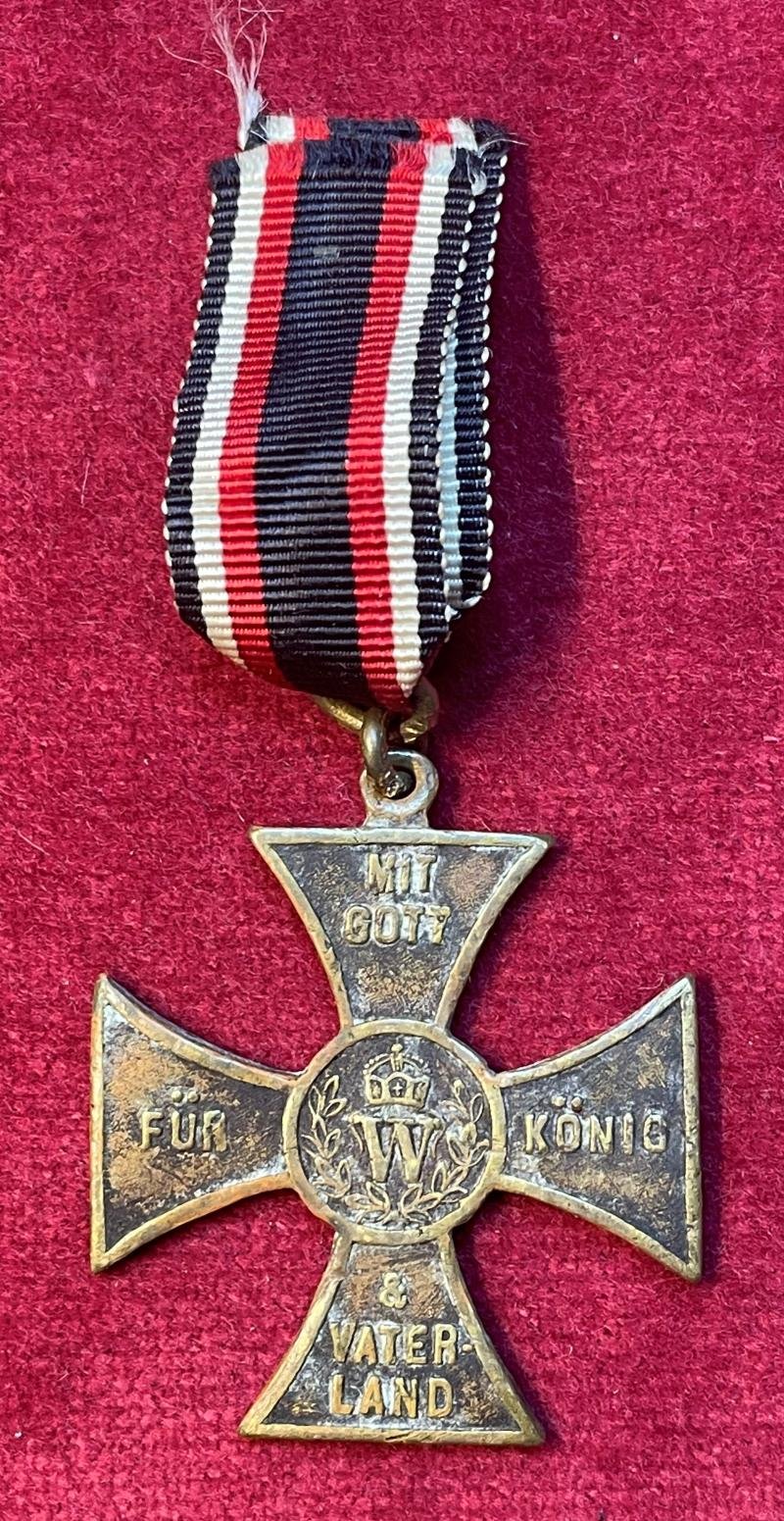 In a very good condition a patriotic cross from army club Rheydt The ribbon is black, white, red which are the colors for the national flag from the Deutsche Reich during the Kaiser era. Frontside: Mit Gott für König & Vaterland. In the middle inside a wreath W (Kaiser Wilhelm II) with imperial crown above Backside: Landwehr Verein Rheydt, in the middle the founding year 1848