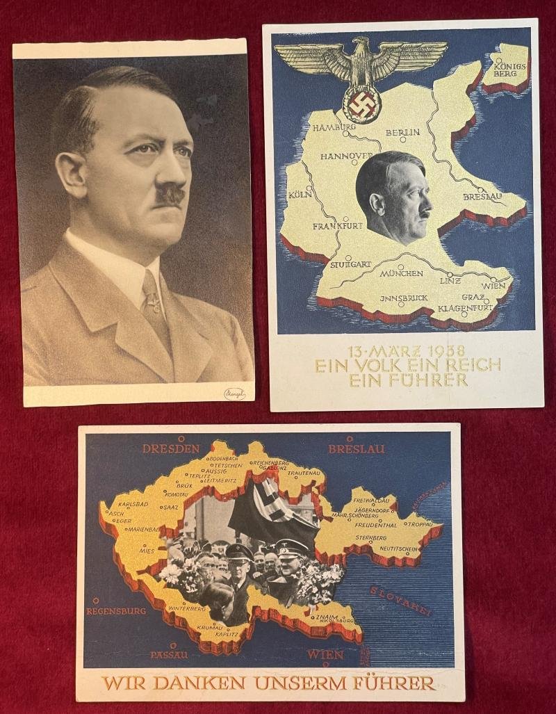 In an excellent condition a lot of 3 postcards 1. Adolf Hitler postcard from Stengel & Co. from Dresden 2. Anschluss Sudetenland 13 Marz 1938 Ein Führer. From Verlag Brend'amour, Simhart & Co' from München 3. Anschluss Sudetenland Wir danken unserm Führer. From Verlag Brend'amour, Simhart & Co' from München The 3rd card has been bent in the bottom. But nothing serious. Please see the photo's