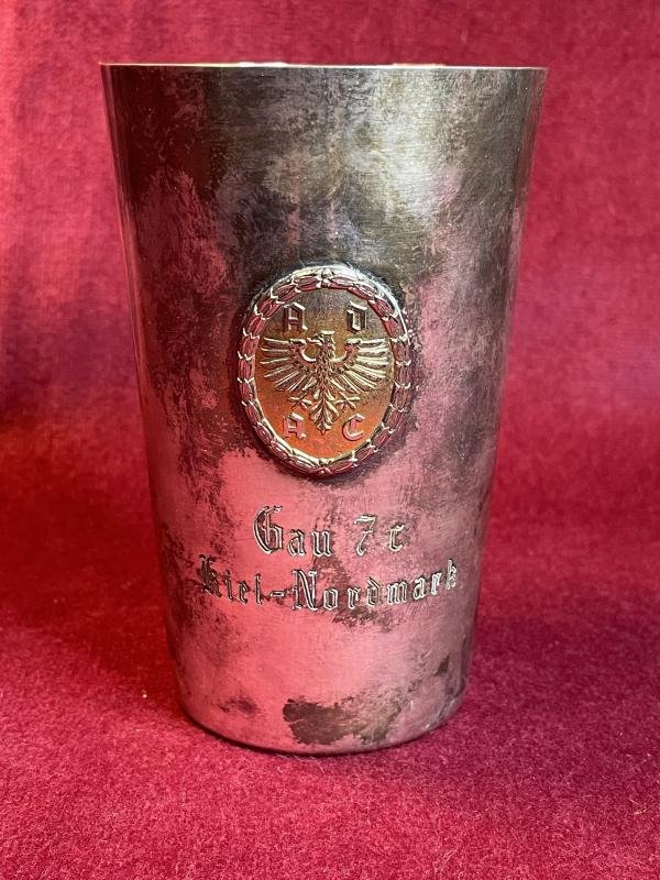 In an excellent condition an apalca silver ADAC 10th price cup Frontside: ADAC (Allgemeine Deutsche Automobil-Club) inside a wreath with eagle. Gau 7c Kiel-Nordmark. Backside: 10. Preis 5. Nordmark-Zuverlässigkeitsfahrt 18.Sept.1932 Underside: Cup size 0,30Liter .The cup has a silver smith hallmark DVN Schwerte, which stands for Vereinigte Deutsche Nickel-Werke, Schwerte und Besteckfabrik Weight of the cup is 185 gram. Size is +/- 11cm high and diameter +/- 7 cm (top)