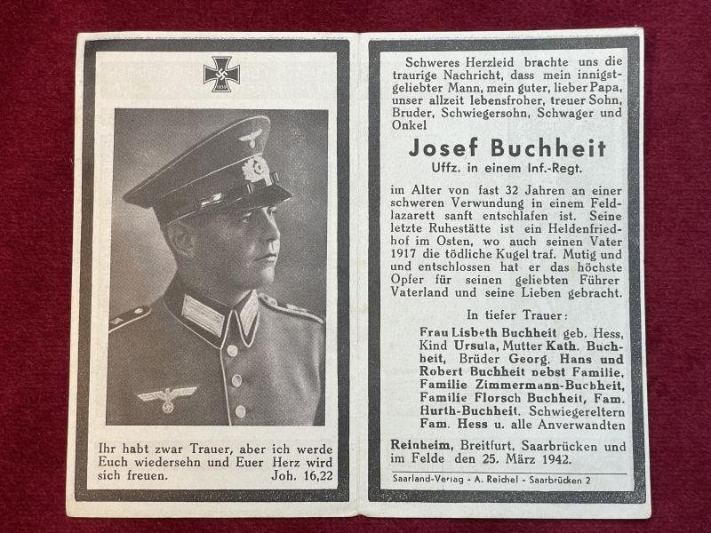 In an excellent condition a death notice from an officer from an Intantery Regiment The death notice is for Josef Buchhet. An officer in an infantery regiment. Receiver of the Infanterie-Sturmabzeichen. He died in the East. Most likely Russia on March 25th 1942